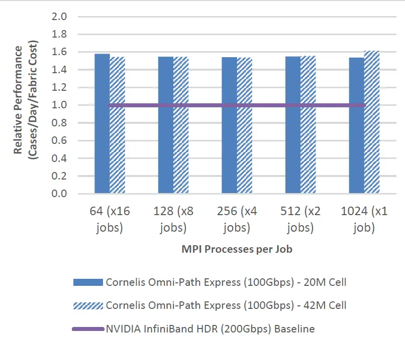 In Figure 3, the results show that a Cornelis OPX connected cluster delivers an average of 1.55x better job throughput per fabric cost running the Motorbike 20M and 42M test cases compared to the NVIDIA InfiniBand HDR cluster. This means users can obtain peak OpenFOAM® performance with a lower budget, or they can deploy more nodes with the same budget to increase computational capacity and/or shorten the time to results.