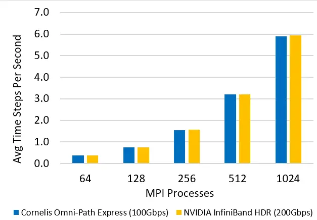 Figure 2 compares the performance scalability of the benchmark using up to 16 Intel Xeon Scalable Platinum 8358 dual-socket nodes, for a total of 1024 cores, connected with Cornelis OPX fabric using a single rail operating at 100Gbps and the same nodes connected with an NVIDIA InfiniBand HDR fabric operating at 200Gbps. Intel MPI 2021.8 is used for both fabrics, with UCX version 1.15.0 from the latest HPC-X v2.15 used for the NVIDIA InfiniBand HDR measurements. Cornelis Omni-Path measurements are performed with the OPX provider from libfabric 1.18.0. The results show that a single 100Gbps rail of Cornelis OPX delivers a comparable level of performance to NVIDIA InfiniBand HDR running at 200Gbps in a 16-node cluster. Each data point was run five times, eliminating the minimum and maximum performance, and averaging the middle three.