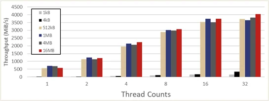 Figure 3. elbencho sequential read performance using a single AMD client node with direct connected Ethernet.