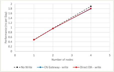 Results of the testing are summarized below showing performance versus node count. For each comparison, the performance of the baseline "no write" runs are compared to the same simulations but when the IO is enabled, either utilizing the Cornelis Networks gateway (blue) or the direct-connect 100GbE NIC. In this latter configuration, the MPI traffic is over Cornelis Omni-Path while the storage traffic goes over 100Gb Ethernet.