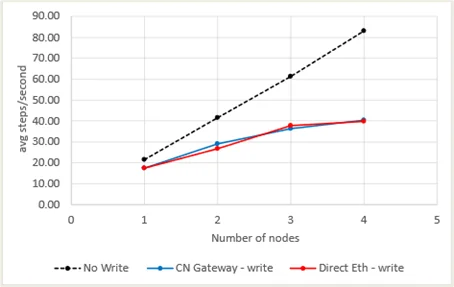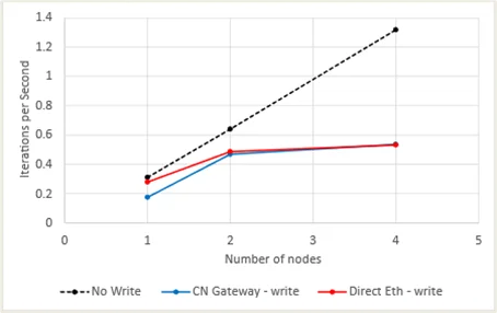 Results for OpenFOAM running a 20M cell motorbike benchmark are shown in Figure 6. Note that near-linear scaling is achieved as expected for the "no write" case. At two and four nodes, the performance of the Cornelis Omni-Path Gateway and the direct-connected Ethernet is almost indistinguishable and should be considered equivalent. The impact of the file IO (every two timesteps) is quite large such that there is almost no performance scaling from 2 to 4 nodes. Though this is an artificially high rate of IO for this application, it proves the viability of the Cornelis Omni-Path Gateway.